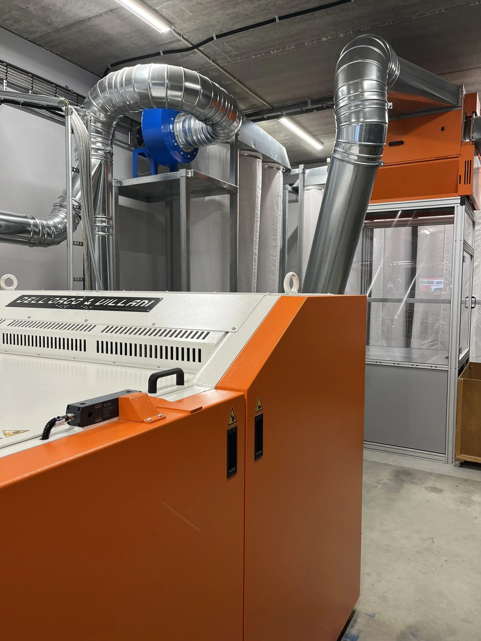 Our machine is a brand new Twin Cardening Opener from Dellorco & Villani in Prato, Italy. It is a small scale recycling line with a capacity of max 400 kg per hour. It is a high tech machine with a combination of mechanical recycling and a digital control center.